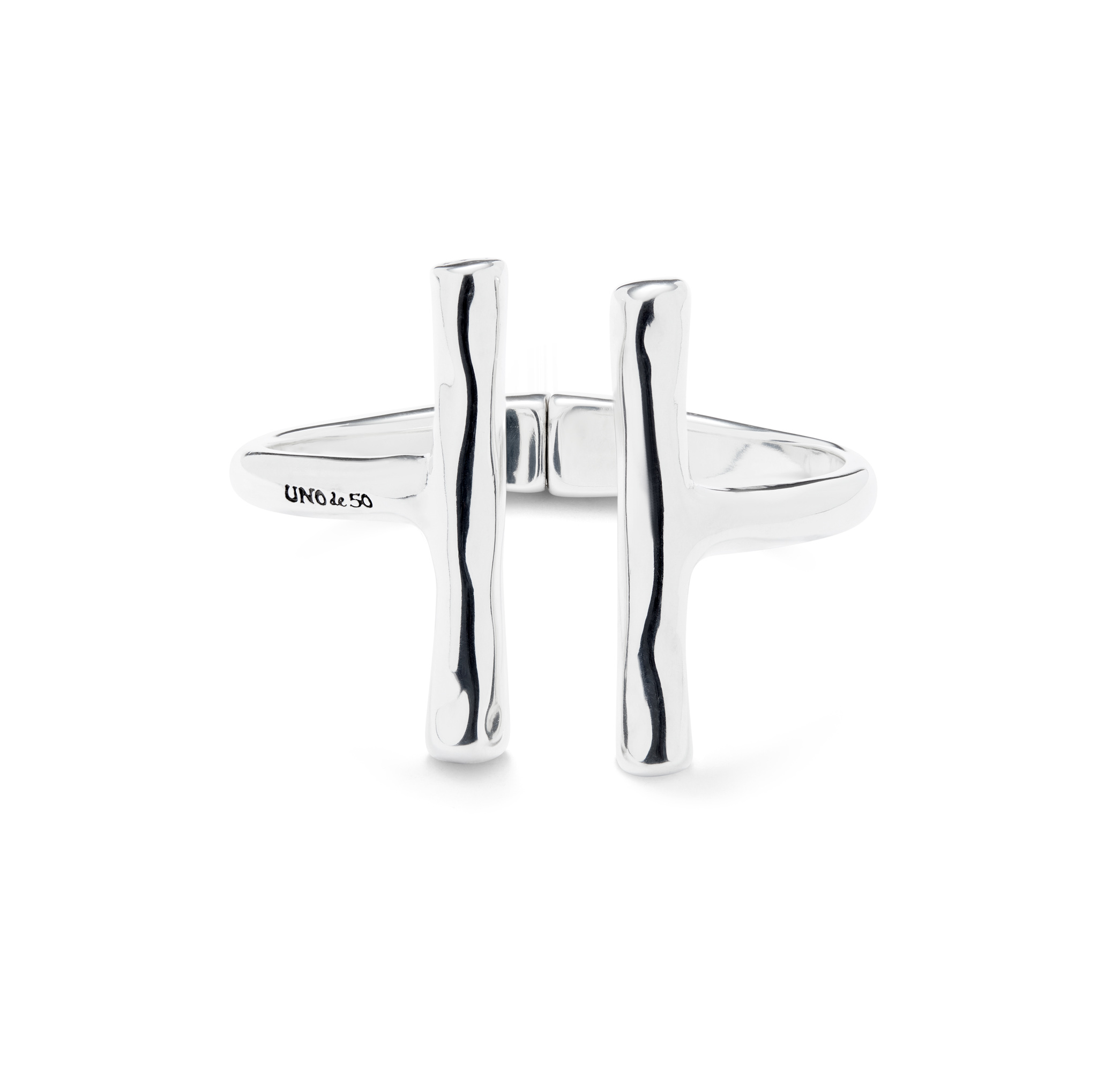 Open rigid sterling silver-plated bracelet with two long tubes at the ends. Made in Spain with a 100% handmade process. Genderless jewelry collection that combines leather with tube-shaped, silver-plated and organic finish pieces. Discover the collection ser natural.
