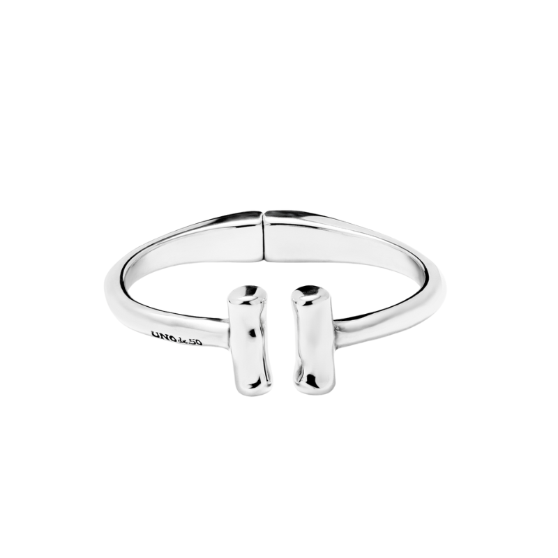 Open rigid sterling silver-plated bracelet with two tubes at the ends. Made in Spain with a 100% handmade process.Genderless jewelry collection that combines leather with tube-shaped, silver-plated and organic finish pieces. Discover the collection ser natural.
