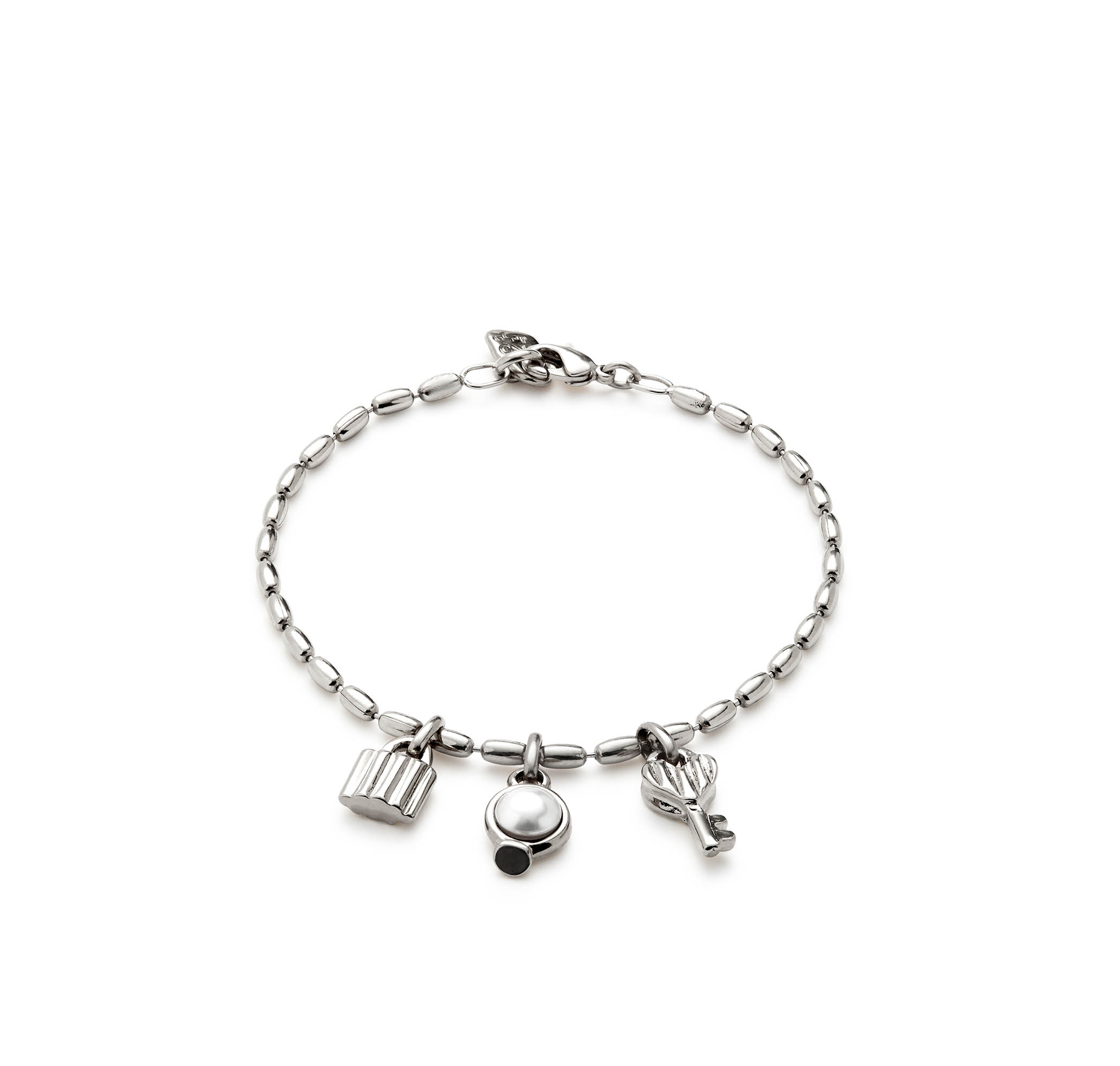 Sterling Silver -plated bracelet with oval bead design, 3 charms, and carabiner clasp. Like all UNOde50 jewelry, this piece is 100% handmade in Spain.