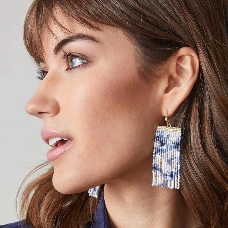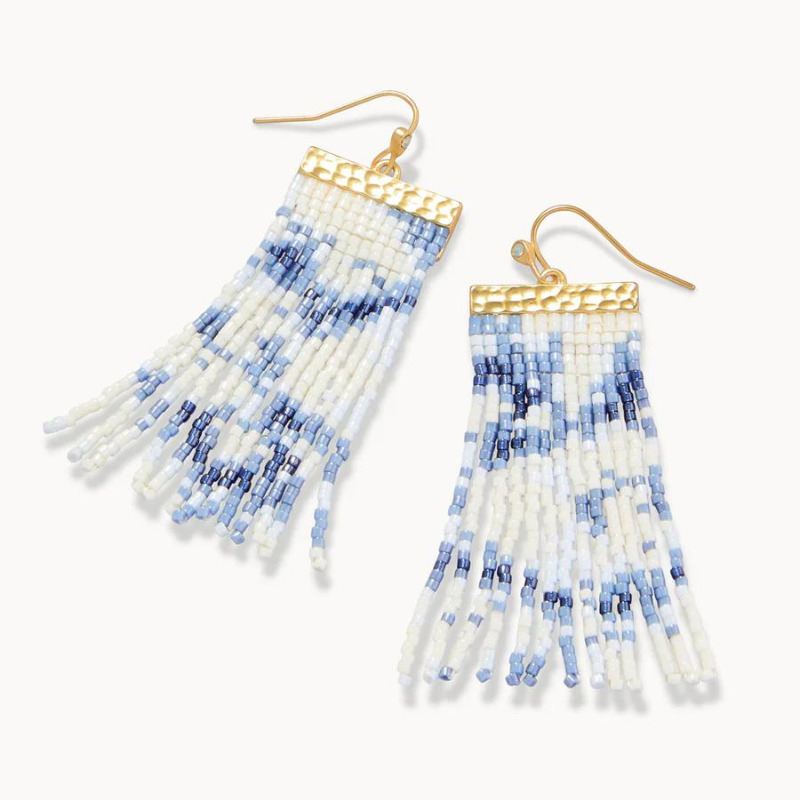 Like the thin swaying grasses of the Lowcountry Salt Marsh, these tassel earrings are all about delicate beauty. Tiny glass beads are delicately hand woven to make these show stopping swinging blue tassel earrings. Topped off with Matte 18kt Gold Plated earring wires with white opal crystals.