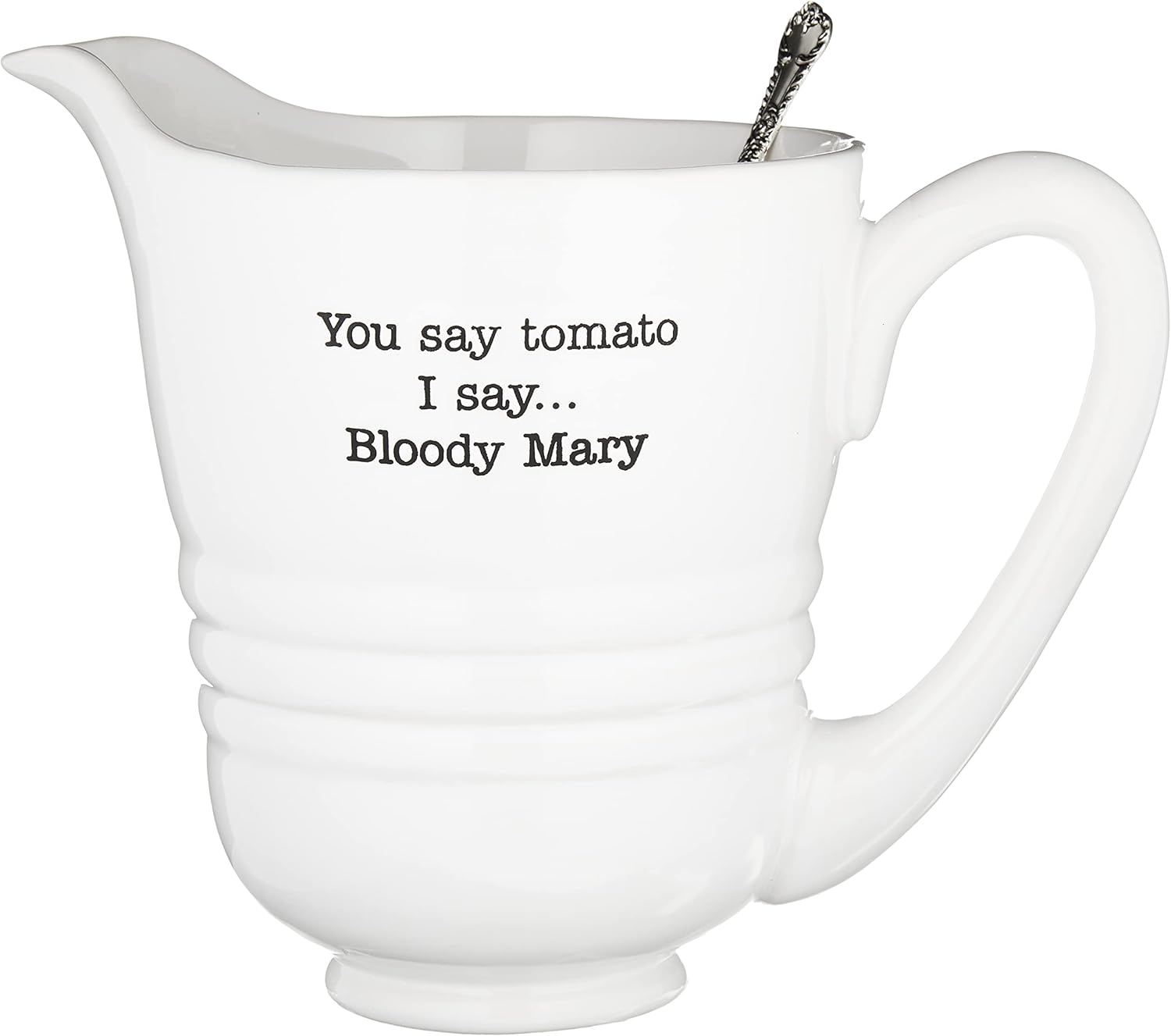 2-Piece set. Ceramic pitcher features “you say tomato I say. Bloody Mary” Sentiment and arrives with long vintage-style “drink your veggies” Stamped silver-plate stirring spoon.