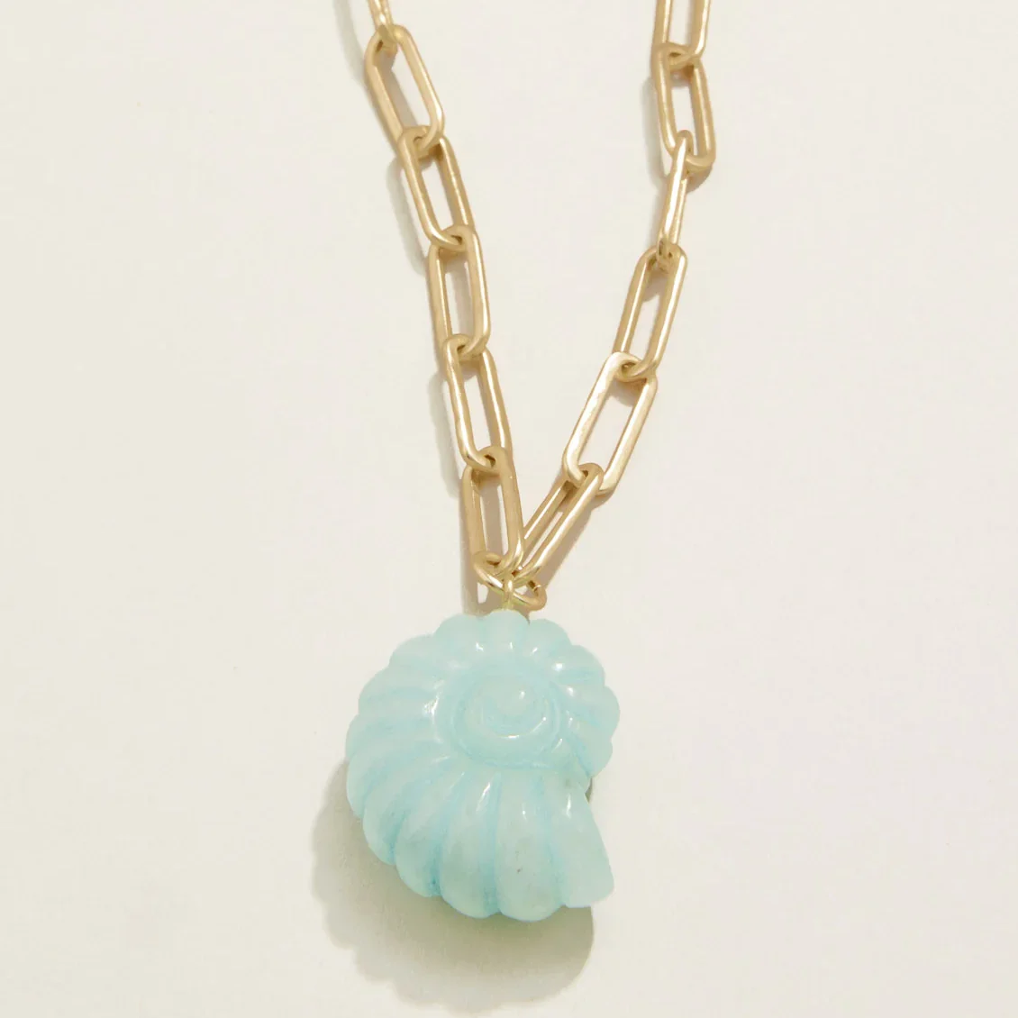 The ocean holds so many beautiful shells and creatures. We are spellbound with this mesmerizing Carved Moon Shell Necklace, featuring carved jade and 18kt matte gold plating.
