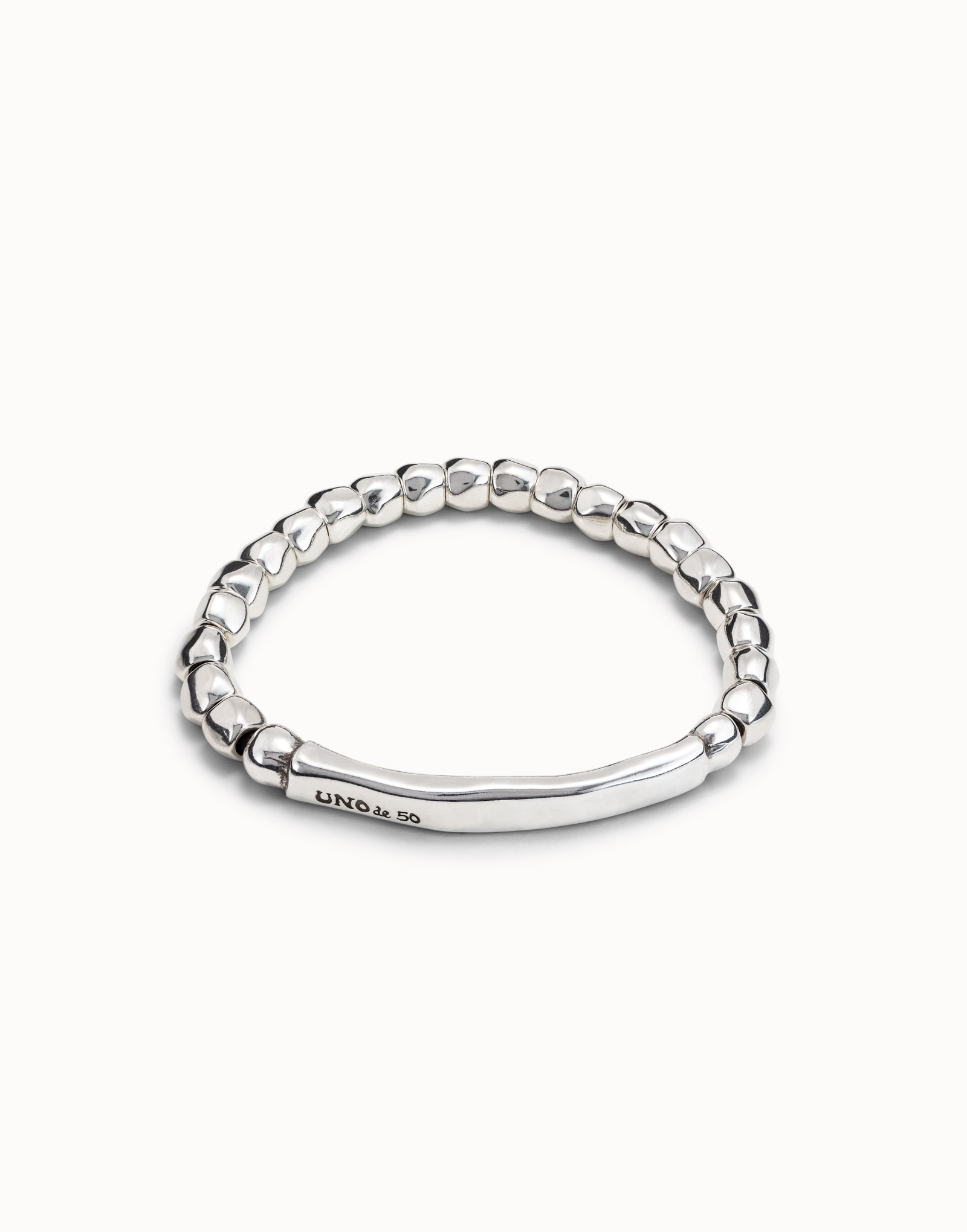 Rigid sterling silver-plated bracelet with multiple irregular stones and a smooth and elongated piece in the center with our logo engraved on it. Made in Spain by UNOde50 under a 100% handmade process. Jewelry 100% handcrafted in Spain, achieving a unique design finish.