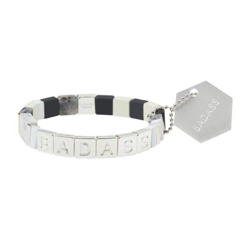 A mosaic of semi-precious stones and matte tile beads are strung together with empowering words to inspire positivity.