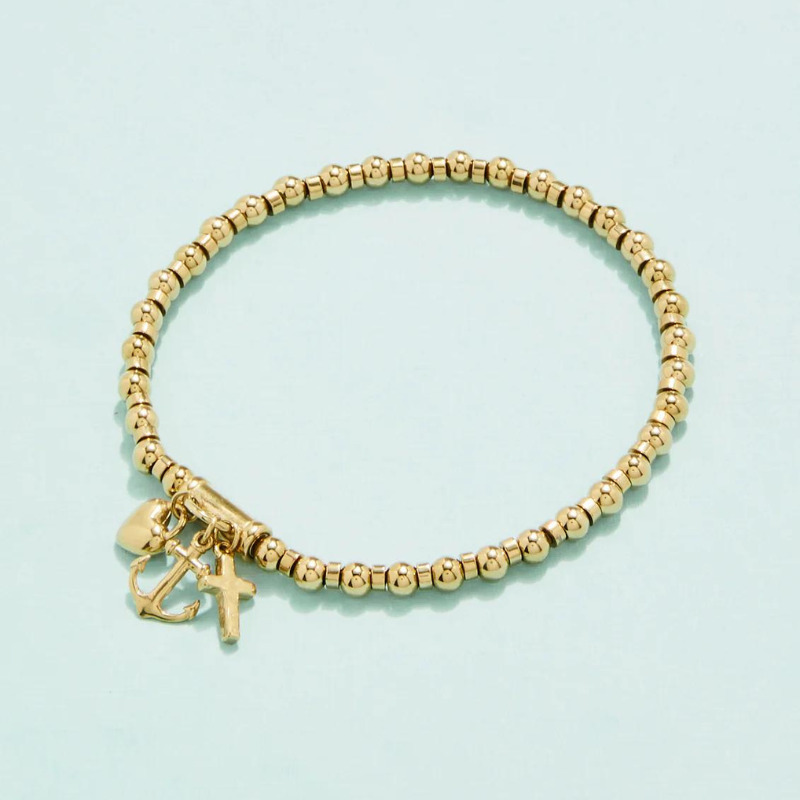 This bracelet is a reminder that that you have faith to believe in the impossible, hope to prevail in the storm and love to conquer all. This easy-on stretch bracelet features classic gold beads topped with dangling charms. Designed to shine through everyday wear, exercise, showers and a summer at the beach in tarnish free 14kt gold vacuum plating.