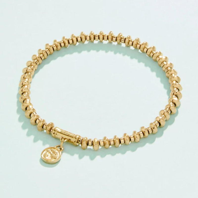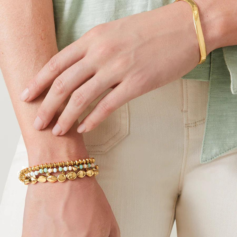 Here is a bracelet you will never have to take off! Great for stacking or mixing and matching this easy-on stretch bracelet features golden textured beads. Designed to shine through everyday wear, exercise, showers and a summer at the beach in tarnish free 14kt gold vacuum plating.