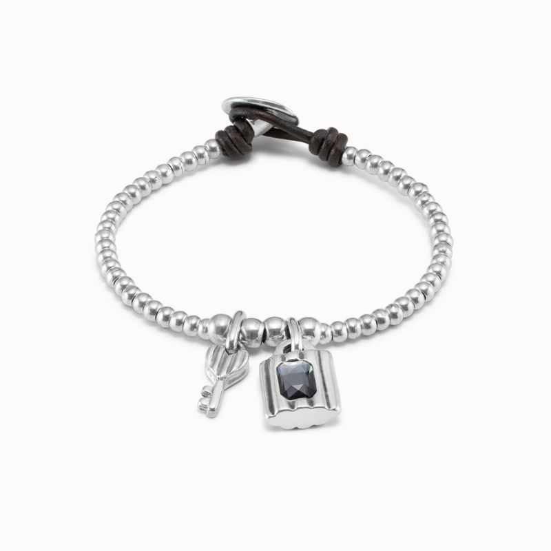 This bracelet from the Confident collection features a design of small beads in the shape of balls. There are two charms in the center, one in the shape of a padlock with a central silver-gray crystal and the other in the shape of a key. A piece handmade in Spain, which will become your lucky charm. The Confident collection symbolizes communication and trust. Aspects that have always been with us and are constantly changing. Independence, confidence, and strength. Something very personal. Unique.