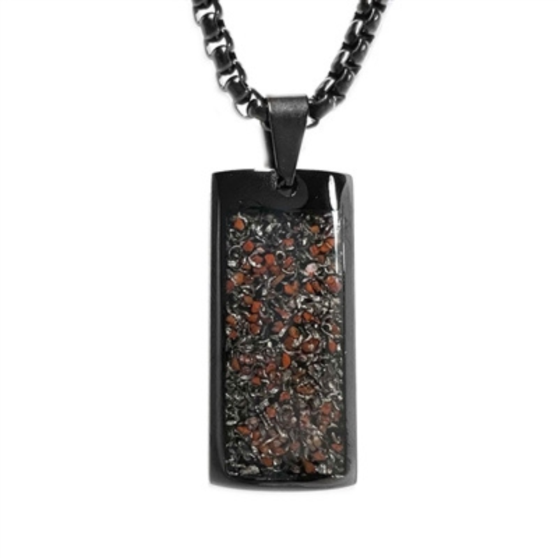 This unconventional and unique Crushed Meteorite and Dinosaur Bone fusion necklace is perfect for anyone who wants an out-of-this-world look. The inlay is set in black stainless steel and features a unique pattern.