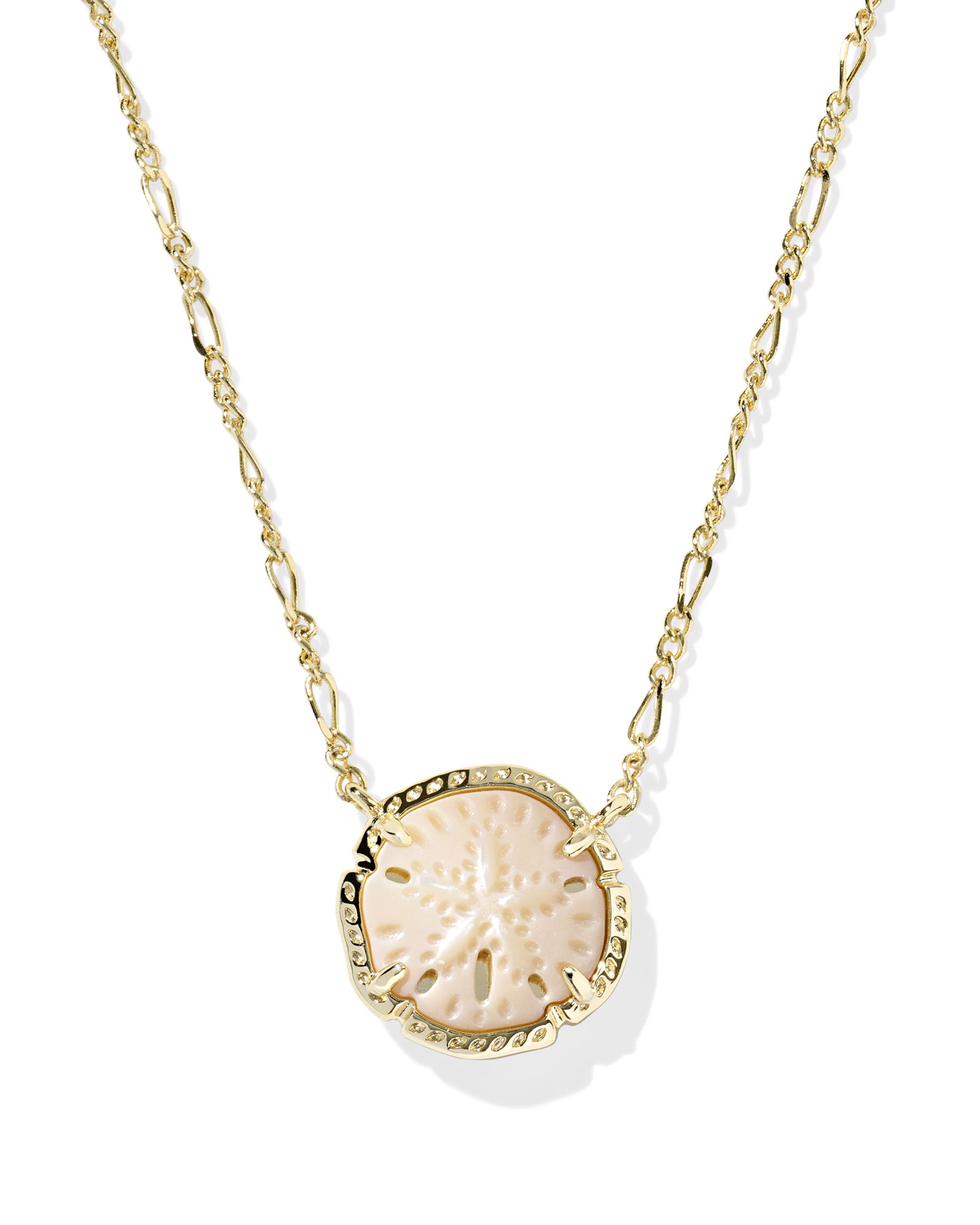 Life’s a beach—why not embrace it? With the Sand Dollar Gold Short Pendant Necklace, you can take an ocean treasure with you anywhere you go. Complete with carved mother-of-pearl and a dainty Figaro chain, this piece is a necessary accessory for any excursion.