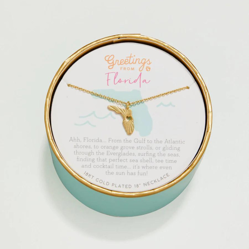 With one of the most iconic state shapes, this Florida necklace is a must have travel memento or a great way to show off your state pride. It comes packaged inside a colorful box with the message: