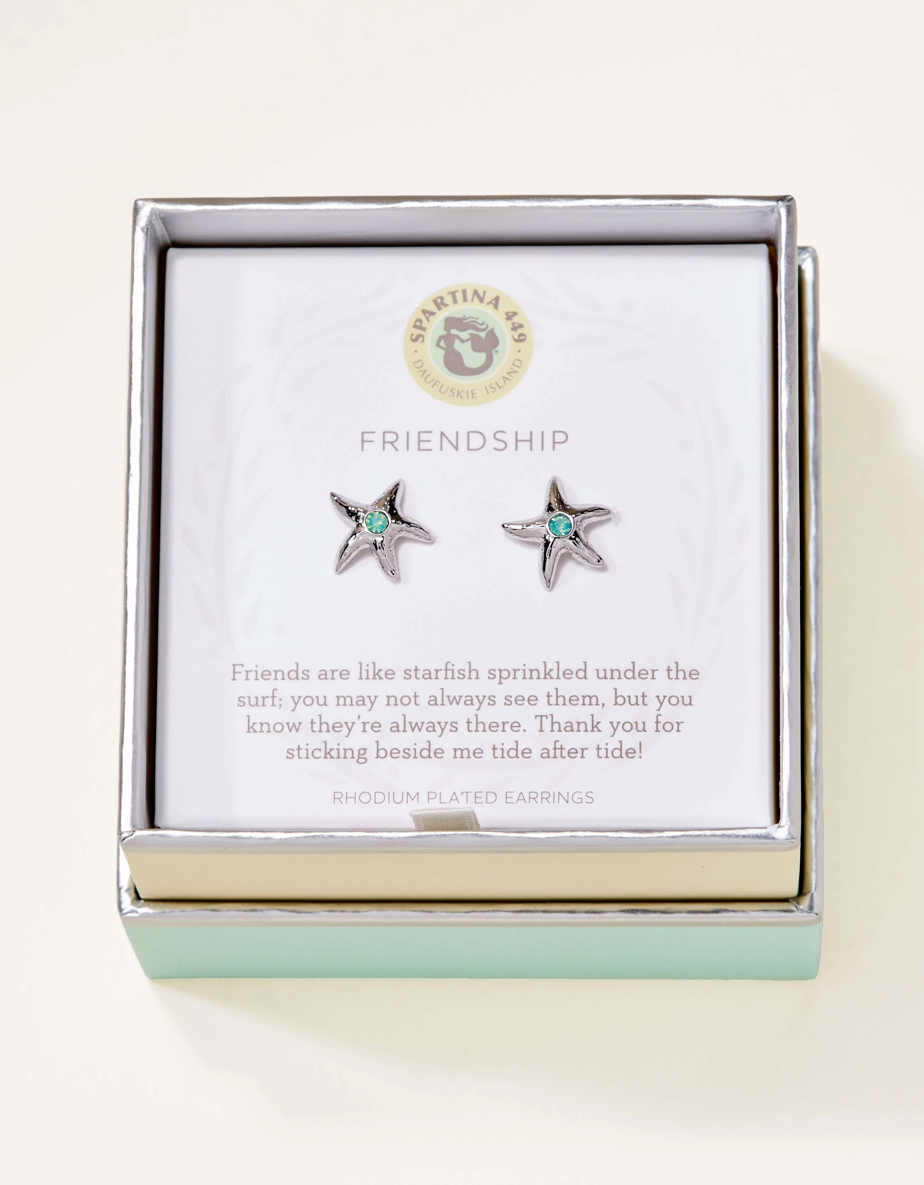 Wear our Friendship Earrings as a reminder that your friends are always there for you. Featuring starfish studs, these earrings come packaged inside a beautiful box with the message: “Friends are like starfish sprinkled under the surf; you may not always see them, but you know they’re always there. Thank you for sticking beside me tide aſter tide!”