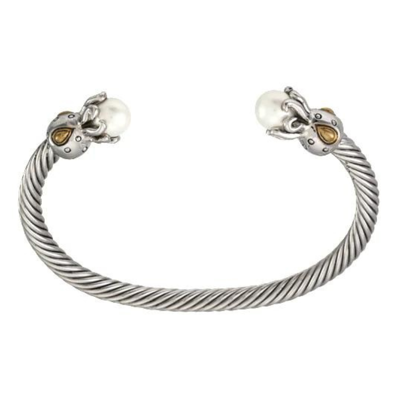 Seaside Thin Wire Pearl Cuff. Freshwater pearl with Intricate hand carved detail, enveloped in Rhodium and 14KT Yellow Gold for tarnish free finish. Handmade in USA