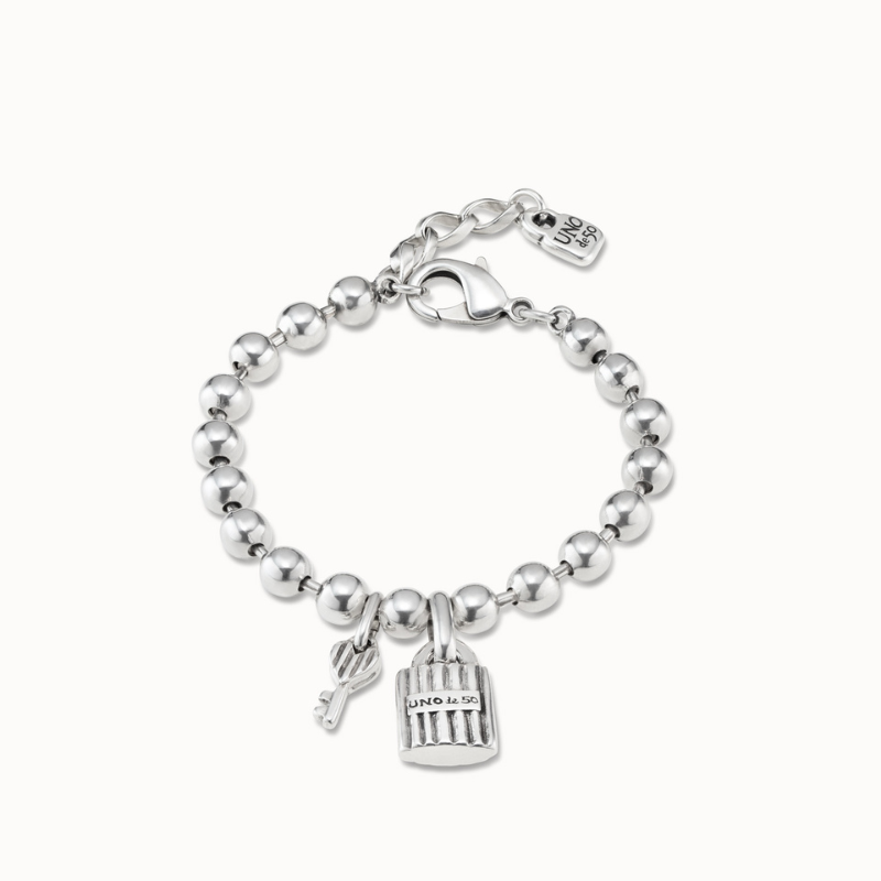Bracelet with beads in the shape of large balls and featuring two charms. One in the shape of a key and one in the shape of a padlock. Its carabiner clasp is adjustable. This jewel made in Spain shows the unique and unmistakable design of UNOde50. The Confident collection symbolizes communication and trust. Aspects that have always been with us and are constantly changing. Independence, confidence and strength. Something very personal. Unique.