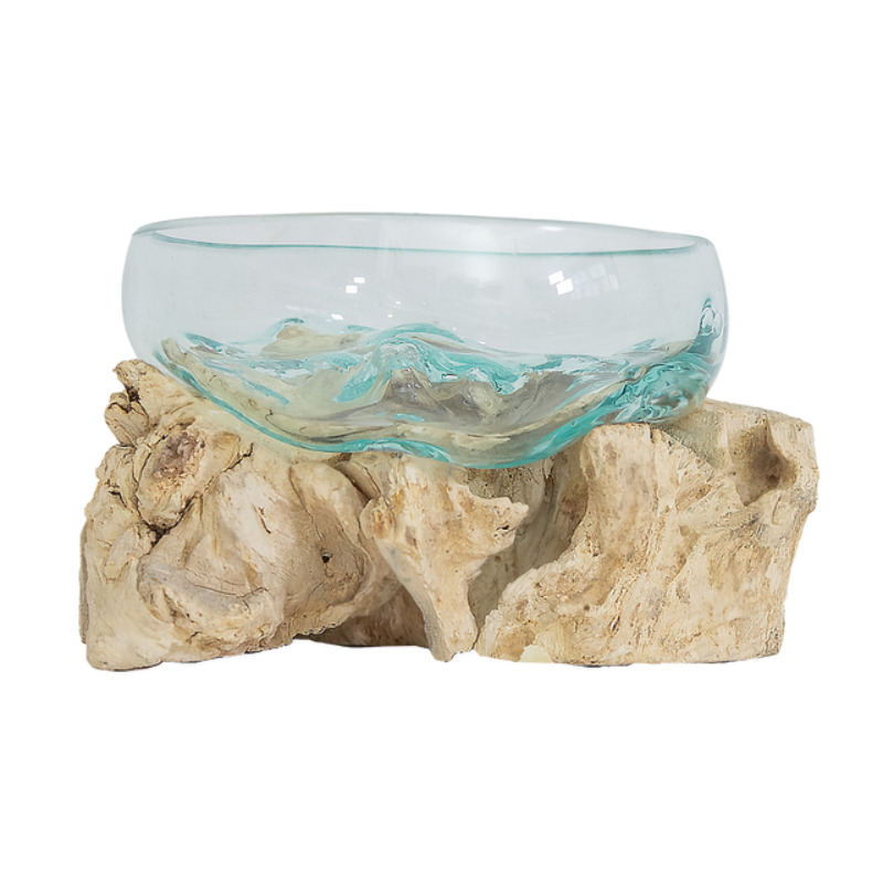 Our blown glass bowl is the perfect accent for any table. Fill with a small plant, sand & shells, or a floating votive. Skilled artisans in Bali, Indonesia use Recycled Glass to hand blow these beautiful one-of-a-kind glass vessels directly on top of Gamal Root bases.