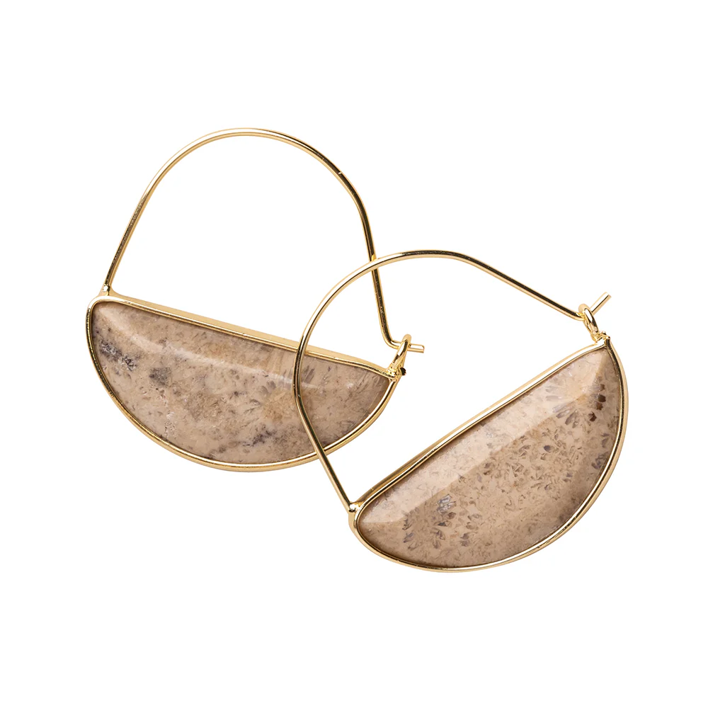 – Materials: 1 3/8” drop, semi precious half-circle stone, 14K gold dipped wire.