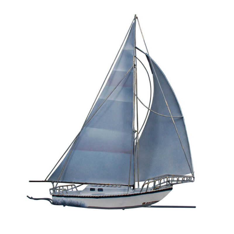 Windjammer, Metal sailboat. The wake laps at the hull and the wind fills the Catalina blue sails of our metal Windjammer sailboat.